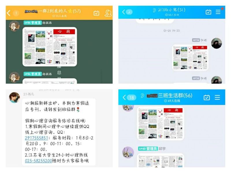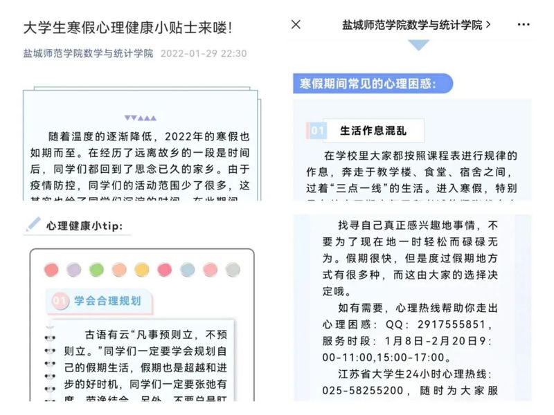 开展网络专题推送:公司心理中心《心潮》寒假适应专刊出刊后,公司立即推送至各班级,加强假期心理防护知识宣传,确保员工及时接受宣传教育。畅通心理援助渠道:公司积极宣传江苏省24小时热线和公司心理咨询热线信息,做好有效沟通,及时疏导员工焦虑情绪,营造健康积极的氛围。