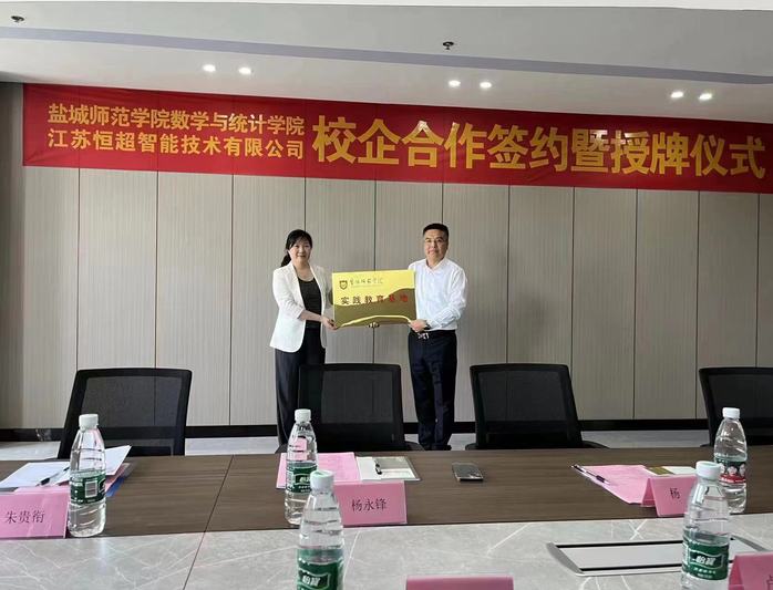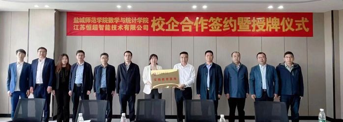 2023年4月20日上午,suncitygroup太阳集团与江苏恒超智能技术有限公司产学研合作签约暨共建实习基地授牌仪式隆重举行。 江苏恒超智能技术有限公司总经理杨永锋、销售总监朱贵衔、suncitygroup太阳集团科技处副处长卢东祥、数学与统计学公司党委书记接玉芹,党委副书记、经理姜海波,党委副书记左飞,副经理王超,信计系主任徐春明,盐南高新区新都街道统战委员杨勇等共同出席签约仪式。