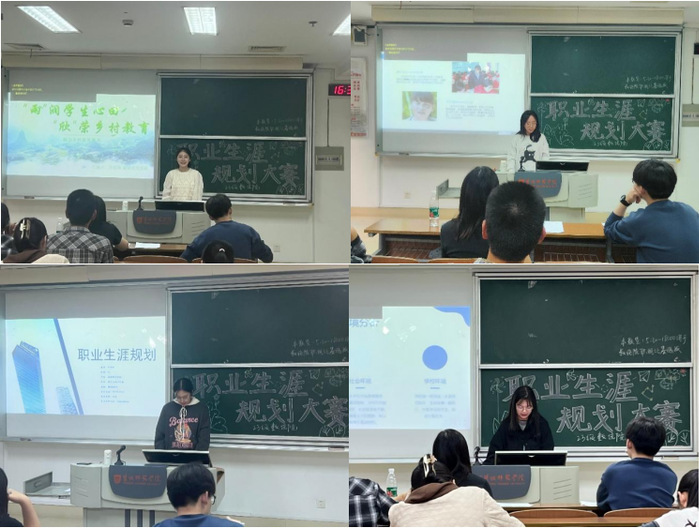 比赛分为就业赛道与成长赛道,在比赛过程中,每一位选手合理运用霍兰德人格类型测试、MBTI职业性格测试等方法科学进行自我认知,客观全面地进行自我与环境认知分析,做出合理的生涯规划和职业决策,并深入讲解实施计划及调整方案。评委对每一位同学的职业规划都做出了提问及指导,观众在旁听的同时也对自己的职业生涯做出了思考。经过院赛选拔,来自不同专业的13名选手进入校复赛。