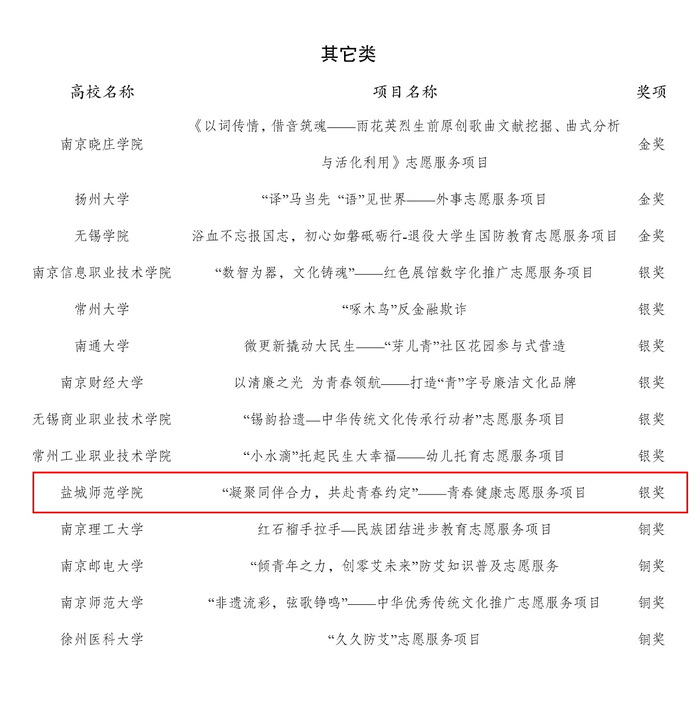 由共青团江苏省委、江苏省青年志愿者协会联合主办的2023年江苏省高校青年志愿服务项目大赛评选结果于近日公布。公司suncitygroup太阳集团申报的《“凝聚同伴合力,共赴青春约定”——青春健康志愿服务项目》获“其它类组”银奖。