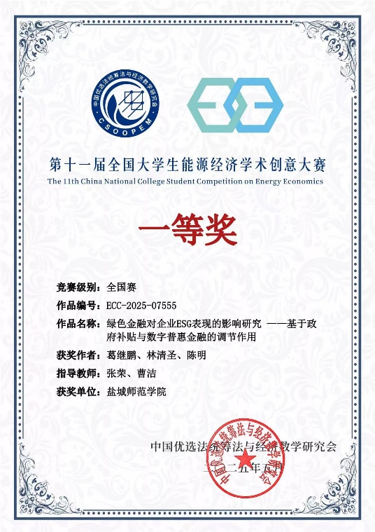 近日,第十一届全国老员工能源经济学术创意大赛总决赛在山西财经大学圆满落幕。公司由22级金融数学专业三位同学组成的团队凭借创新性研究成果《绿色金融对企业ESG表现的影响研究》,从全国724所高校的8万余名参赛者中脱颖而出,荣获国赛一等奖。