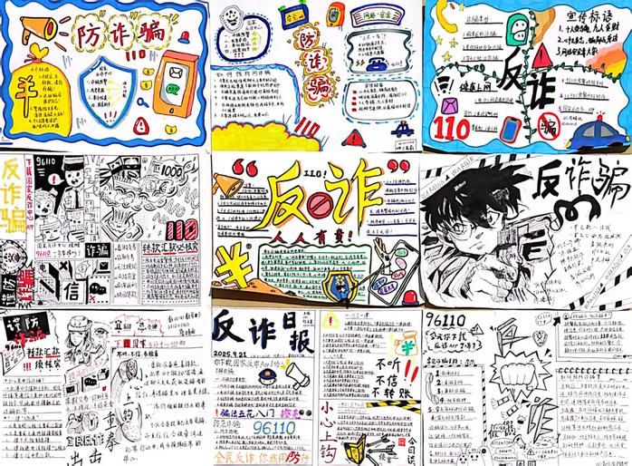 通过开展绘制“反诈”主题手抄宣传报活动,意在加强新生对“反诈”知识的理解和印象。将所学知识融会贯通,借助插图、线条、色彩等元素,丰富了手抄报的表现形式,帮助新生主动了解和牢记“反诈”各类提醒,以期警示自我,教育他人。