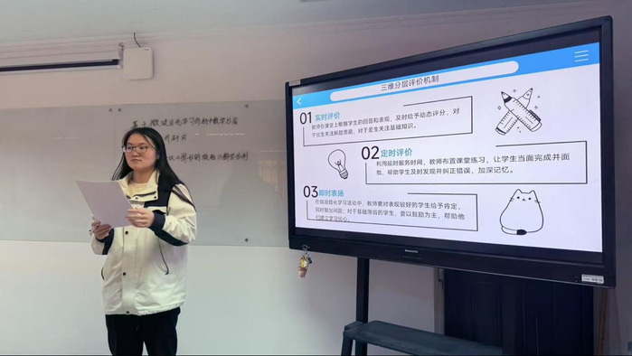 汇报中,戴模从数字技术驱动中学数学“教学评”一体化的角度出发,以“复数的概念”为例,展示了如何利用数字技术实现教学、学习与评价的深度融合与个性化反馈。丁妍以导数为例,分享了高中数学学法指导的实践与探索,提出了四步学法指导策略,通过概念生活化、模板训练和分层教学帮助员工攻克导数学习难点。王婧以“图形的旋转”为例展示设计与评价方法,研究通过微项目化学习和分层教学实现个性化教学。刘宇探讨了如何通过结构化教学策略将初中函数知识系统化,提升员工整体理解与教学效果。